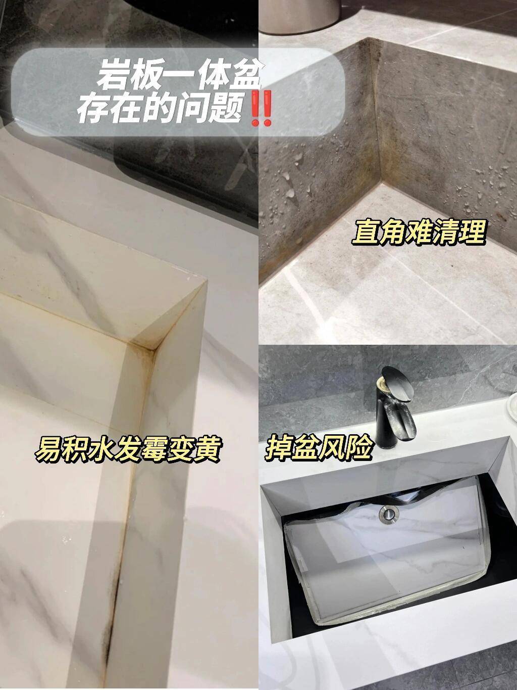 岩板一体台盆:颜值与实用的双重考验岩板一体台盆,以其高级的质感和简约的设计,一度成为卫生间装修的热门选择。其流畅的线条和冷峻的色调,为空间增添了几分现代感。